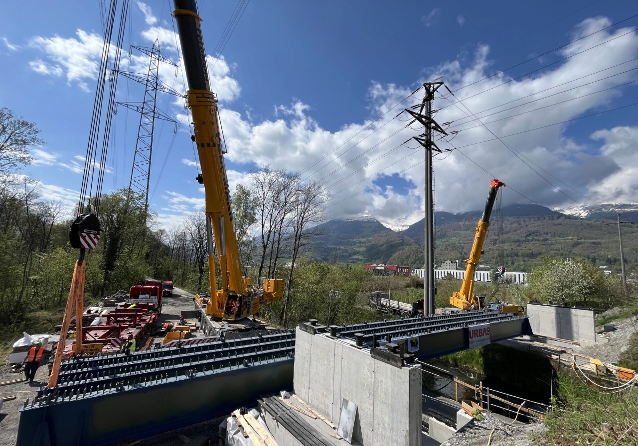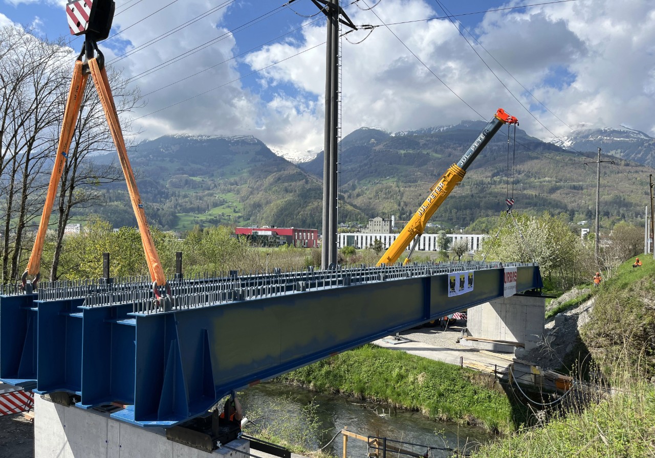 Ein zentraler Meilenstein wurde kürzlich mit der Montage des Tragwerks der Brücke BR06 über den Werdenberger Binnenkanal erreicht. Das rund 73 Tonnen schwere Tragwerk wurde präzise auf eine eigens errichtete Einschubbahn neben der bestehenden Brücke gehoben.